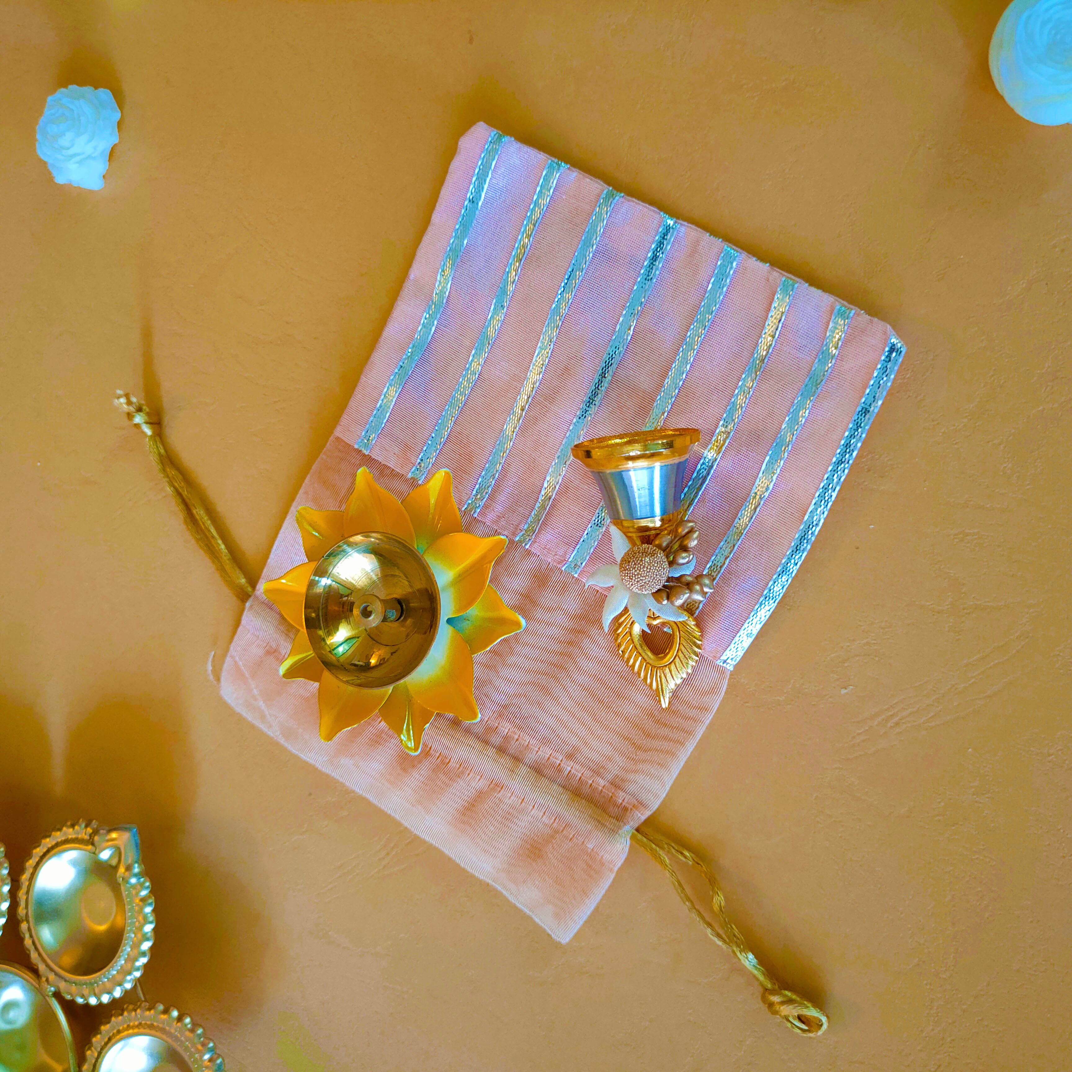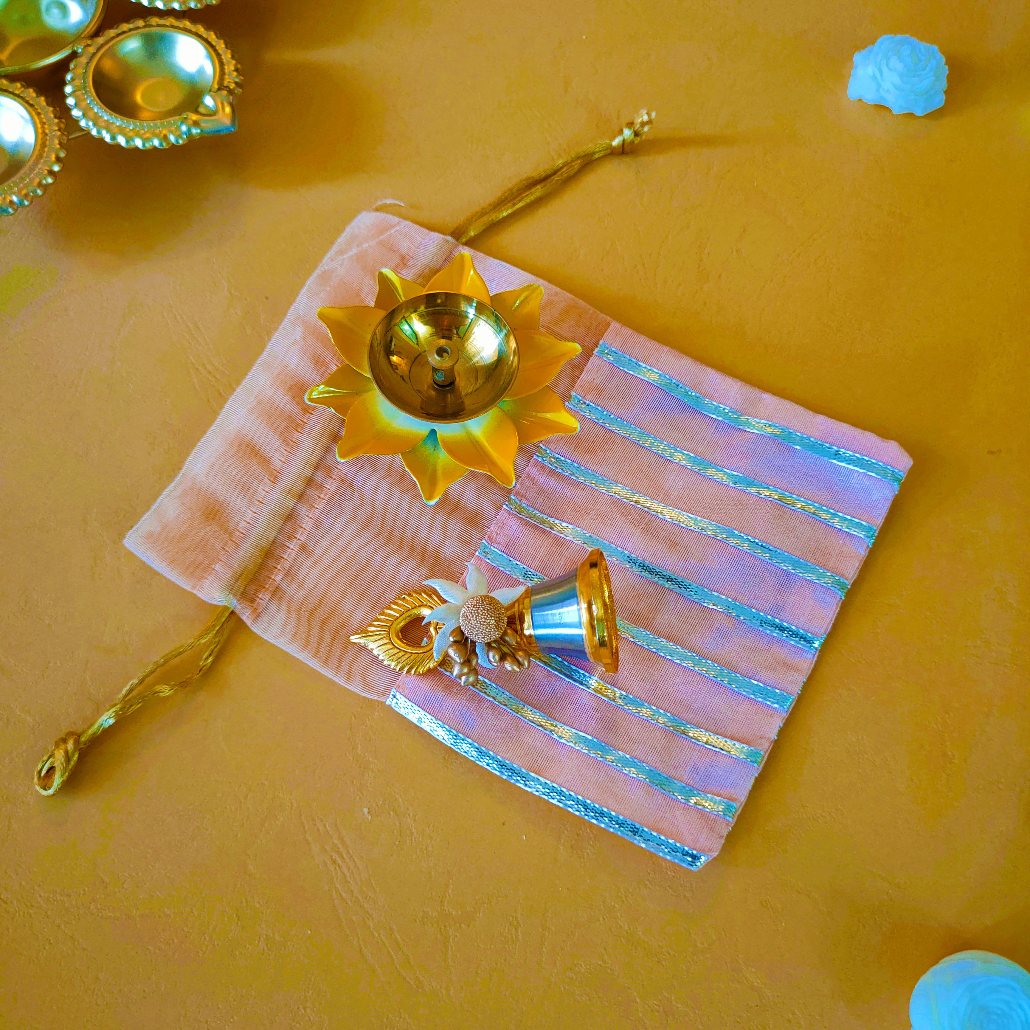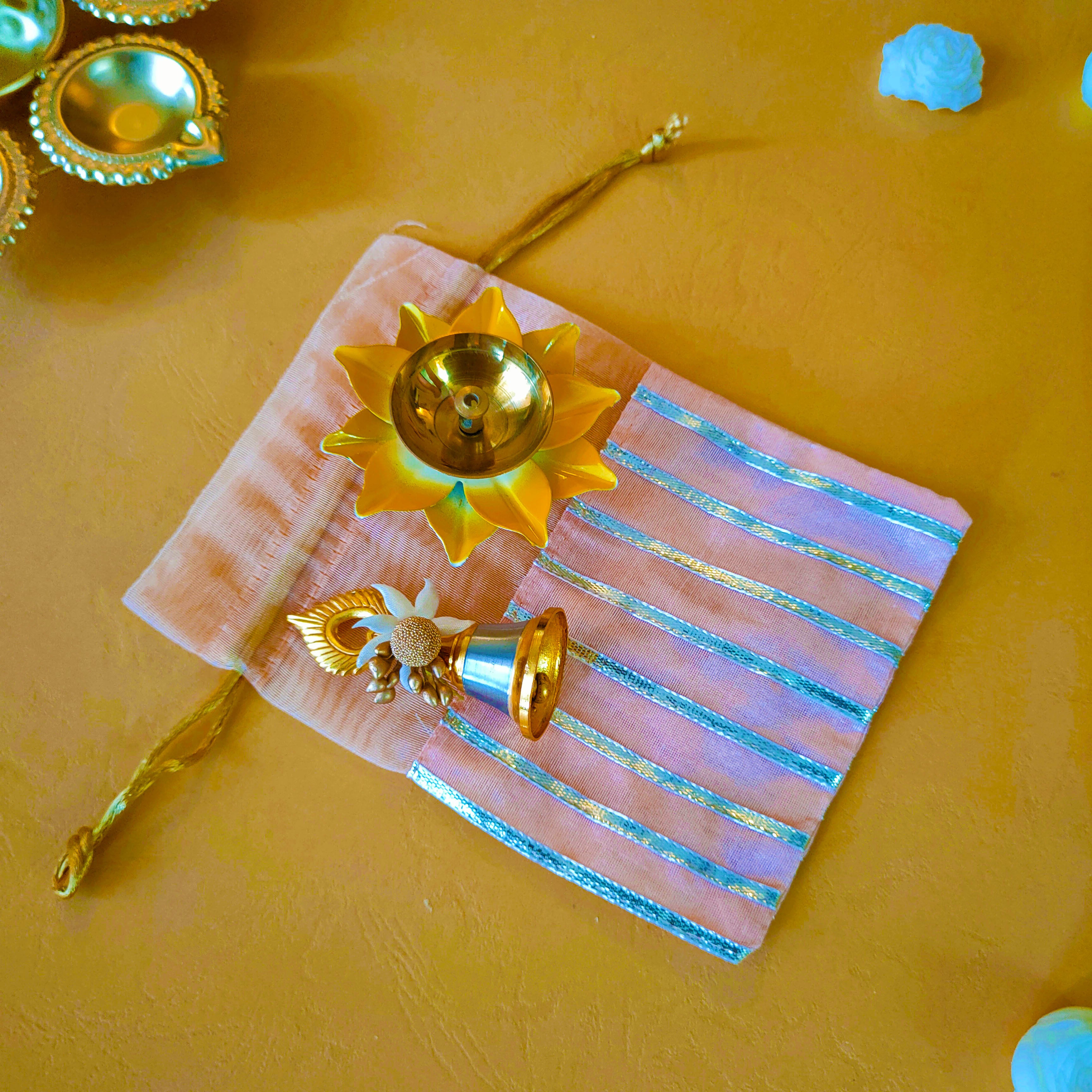 Celebrate traditions with elegance through our Divya Aarti Set, featuring a finely crafted metal flower diya and a decorative pooja bell, beautifully packed in a festive fabric potli.